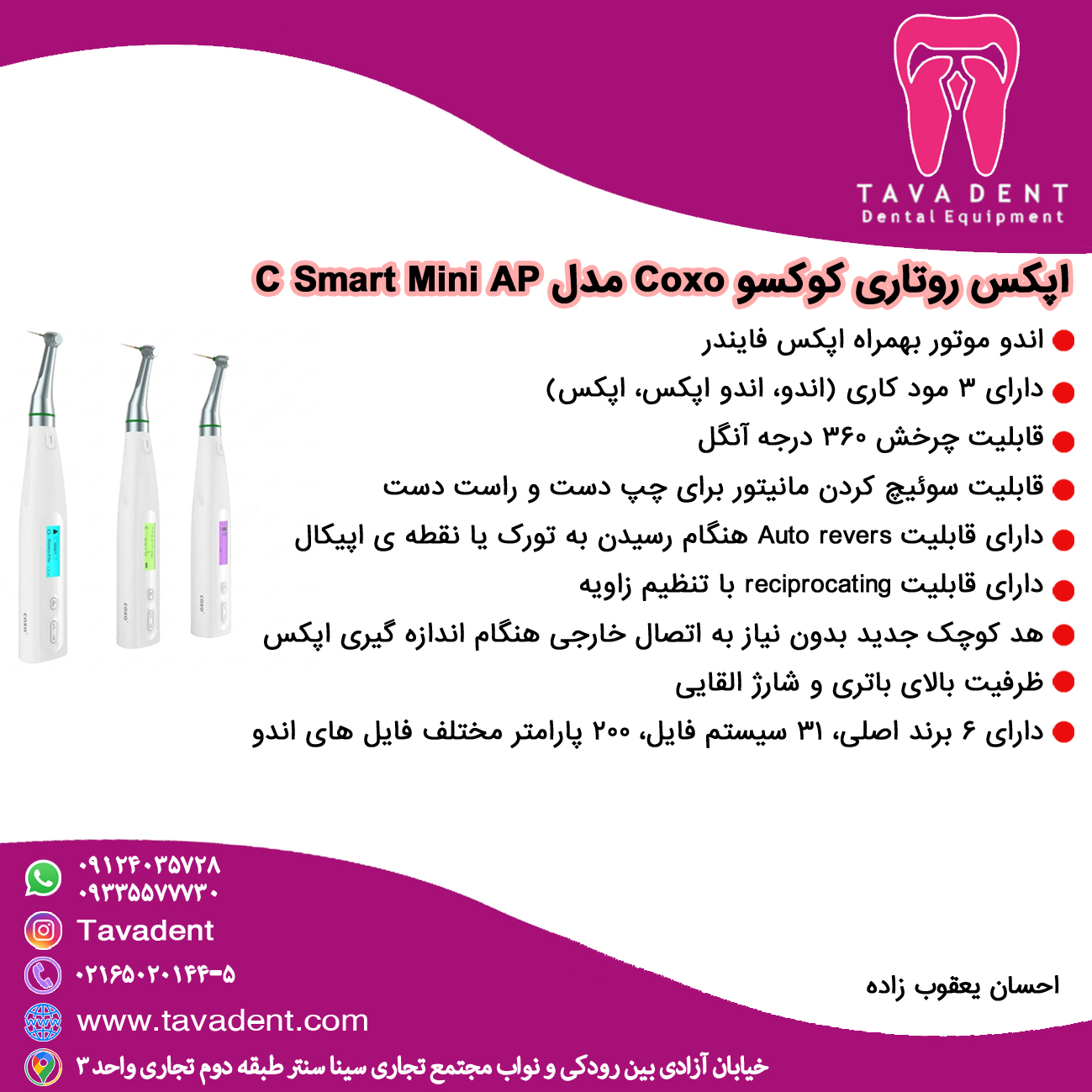 | دارای قابلیت | دارای قابلیت Auto revers هنگام رسیدن به تورک یا نقطه ی اپیکال_دارای قابلیت reciprocating با تنظیم زاویه |